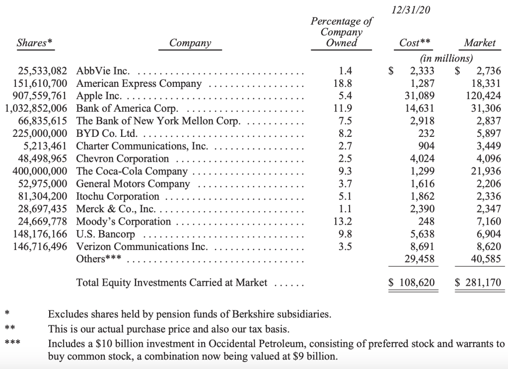 以上是年底結算時波克夏擁有股份中市值前 15 大的列表。